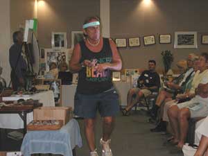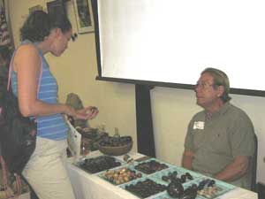 At the 2006 Sea-Bean Symposium, Bill Blazek provided a display (photo to left) of many sea-beans that had been polished by hand sanding. He also did a slideshow presentation in full beachwalking attire (photo to right). Bill's slides are presented here, as well as his instructions and guidance (see below) for hand sanding (polishing!) sea-beans. |