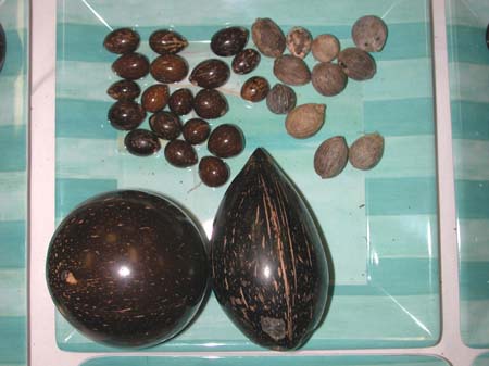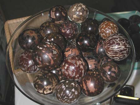 Among the most interesting beans to hand-polish are sea coconuts. By sanding partially though the outer layers of the bean, a variety of hues and textures will present themselves. Inasmuch as most sea coconuts have broken and wrinkled outer layers, much care must be exercised in selecting the rare spherical beans with smooth, unbroken "skins." Additionally, it's best to let even these beans "dry" for several months to ensure that no cracks or wrinkles develop prior to polishing. With sea coconuts, there is no substitute for experience in choosing those particular beans that will best result in good "final products." |