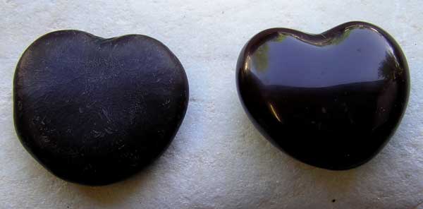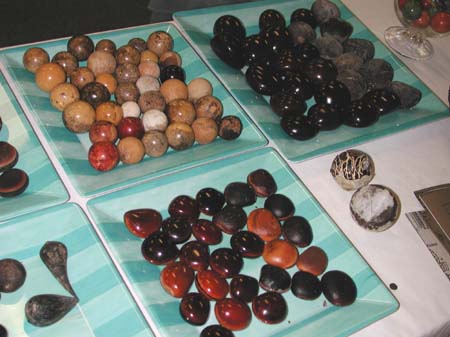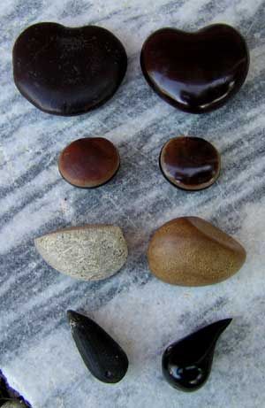 Additionally, so are the photos! To the left, top to bottom, are Seahearts (Entada gigas), Red Hamburger Beans (Mucuna urens); Crabwood (Carapa sp.); and Starnut Palm (Astrocaryum sp.). Below is a close-up of the pair of unpolished and polished Seahearts (Entada gigas) shown at the top of the photo to the left. ![]() Photo: Mike Ley |