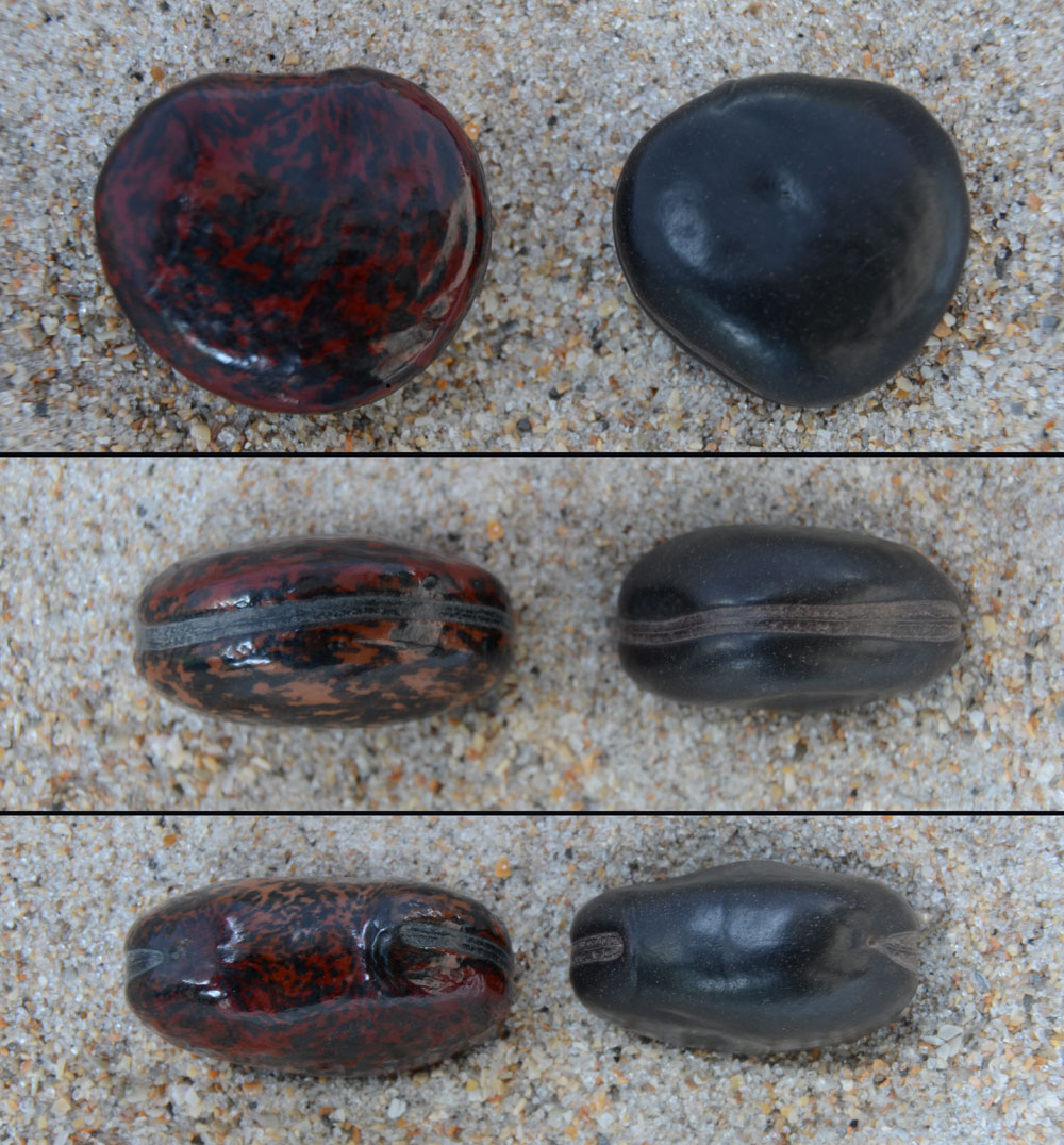 Mucuna gigantea color variations, showing its side, top, and hilum.