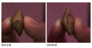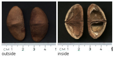 ![]() Photos courtesy of Detlef D. ("Det") This seed was collected by Det, along with many others from beaches near Speyside, Tobago The fruit outside is hard and woody and on the more rounded side there is a small hole, maybe a micropyle? The fruit dimension is round about 3 cm in length, 1.8 cm in width and 1.5 cm in height. |