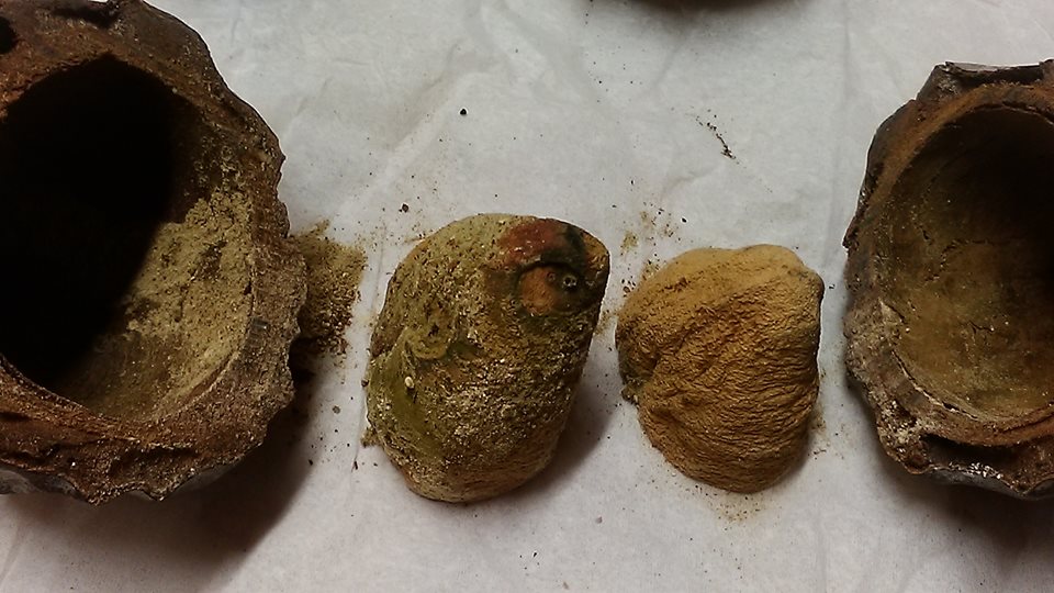 | A couple specimens of Andira galeottiana were sliced open by Paula Rose to examine their contents and investigate what makes them rattle after being dried out. The following photos show the very different interiors of the two specimens which had been found washed ashore in southeastern Texas, USA. One specimen was relatively empty with several pieces of dried material; the other specimen showed a quite solid interior.