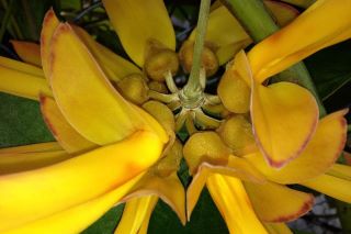![]() Ventral view of nearly mature flowers of Mucuna elliptica. Note that the bracts have fallen off at this stage. December 2011 Photo: Christopher Boykin Note the coloration of the base of the flowers, similar to the flower petals, along with the pinkish marginal coloration of the flowers. |